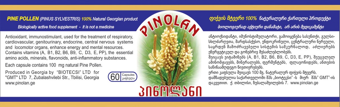 პინოლანი არის უნიკალური თვისებების მქონე ბიჭვინთის ფიჭვის (Pinus pityusa) სახეობის ყვავილის მტვერი, რომელიც მოპოვებულია ბორჯომის ეროვნულ ნაკრძალში ზღვის დონიდან 1500 მეტრ სიმაღლეზე. ფიჭვის ყვავილის მტვერი დამუშავდა და დოზირებულად დაკაფსულდა ევროსტანდარტის მოთხოვნათა შესაბამისად ISO სერტიფიკატის მფლობელ ფარმაცევტულ საწარმოში.